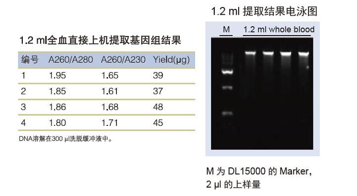 ■ 起始样本量灵活:选择相应的试剂盒可以直接提取200 µl、400 µl、1.2 ml 的全血或通过前处理提取1-3 ml 全血分离白细胞的 DNA。