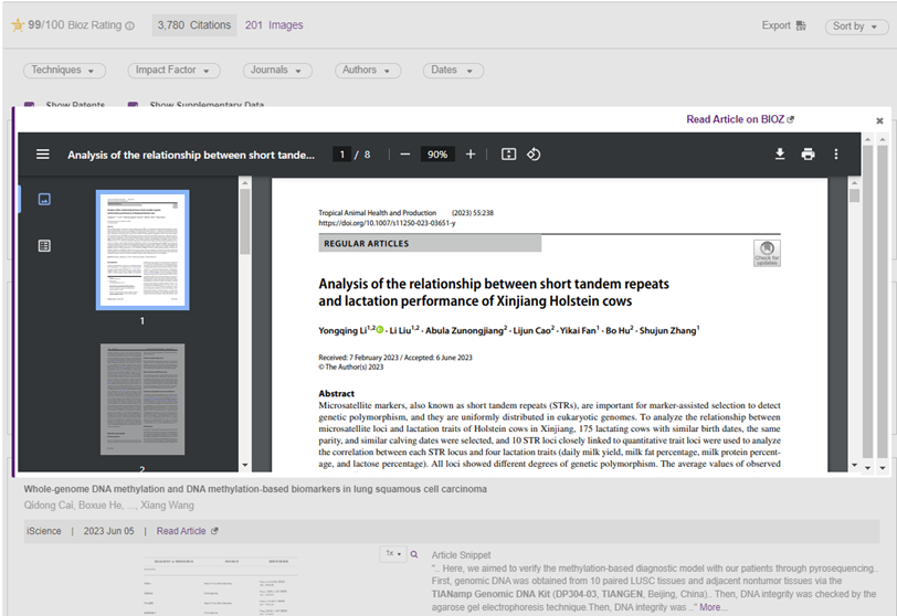 该数据库通过人工智能大数据分析,从BioZ数据库包含的4万余篇使用TIANGEN产品的文献中,为您抓取和呈现与产品匹配的相关英文引文。