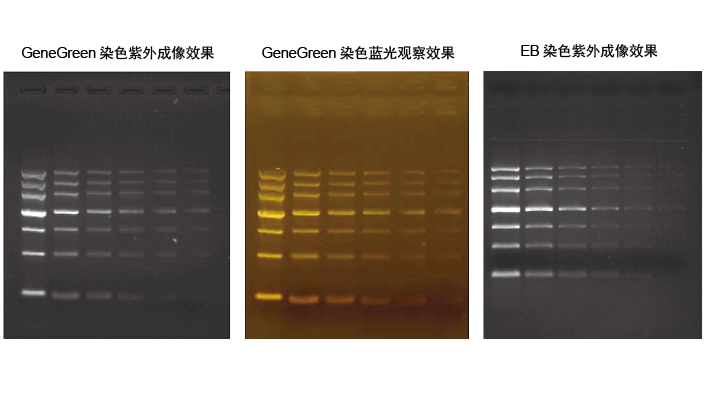 GeneGreen 核酸染料是一种以花菁为基础进行改良的油性大分子,降低了传统花菁类核酸染料在电泳过程中对核酸迁移率的影响,不会产生电泳条带弯曲现象。该染料不能穿透细胞膜进入活体细胞内,不易挥发而被吸入人体,诱变性远远低于EB。可在蓝色可见光激发装置下进行切胶回收,安全方便,是一种安全无毒、高灵敏的新型核酸染料。