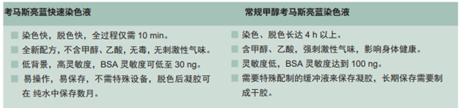 TIANGEN 公司研制生产的考马斯亮蓝快速染色液是一种即用型快速灵敏而且安全的考马斯亮蓝 G-250 染液,采用独特配方配制而成,用于 SDS-PAGE 或非变性 PAGE 蛋白电泳胶的快速染色。这种染料节省了制备相关溶液所需的时间和精力,无毒性而且不需要酸、醇固定或者脱色,以其方便快捷的操作,卓越的灵敏度,成为蛋白质染色产品中的推荐之选。