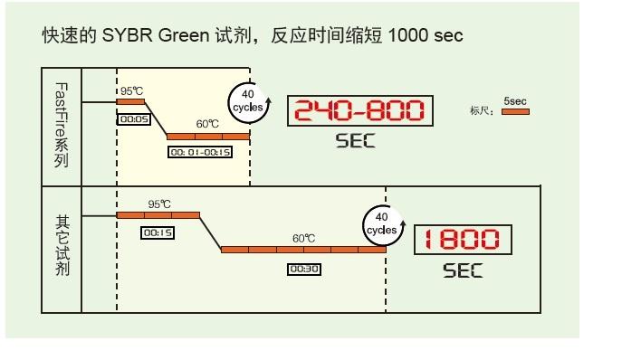 ■ 快速:FastFire 系列的 SYBR Green 法产品,采用了可快速激活的抗体修饰 Anti Taq DNA 聚合酶,配合独特的快速 Buffer 体系,可节省多达 60% 的反应时间,成为目前市面上快速的 SYBR Green 试剂。